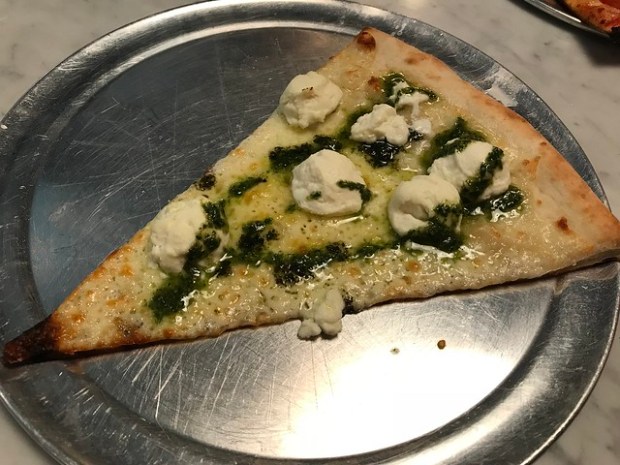 I got the pesto which I loved. The soft ricotta cheese was so good. And I liked the chewy crust and yes, they heat it up for you after you pick it out of the case. Or you can go with custom slices. If you have a big group, you could go for a whole pie, too!