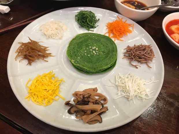 We did order an appetizer. These little wraps that you can roll up vegetarian fillings including julienned egg and mushrooms. I called them Korean tacos.