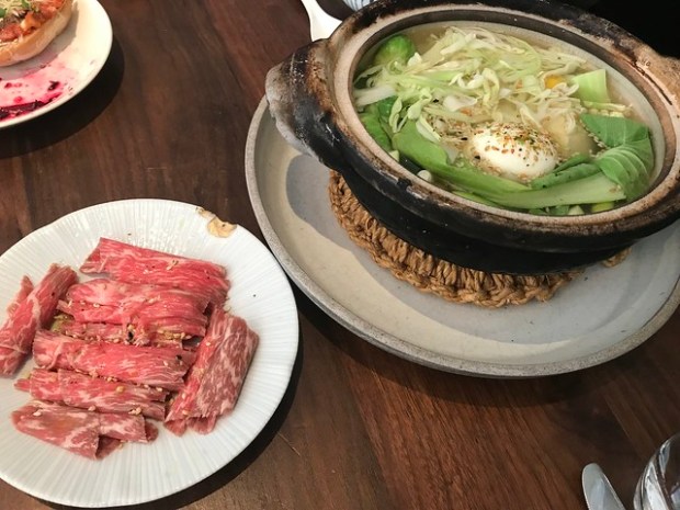 We got the Wagyu beef donabe for two. Donabe is the Japanese pot the hot soup is served in and the idea is you swish around the beef gently like shabu shabu. It’s so tender, a couple of seconds is good. I do recommend getting rice. This portion is meant for two but I feel I could have had it all myself!
