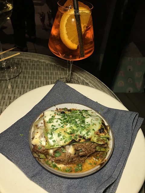 I wanted to get the lasagna which arrived piping hot. I paired this with an Aperol Spritz. I’m no somm but I thought it was a good combo. The citrus cut through the heavier meal.