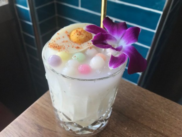 The new plant based Nic’s on Beverly (in the old The Ponte space) will be featuring a Negroni called “Jean Claud Van Groni” which I imagine is what happens when Jean-Claude Van Damme drinks. This is a the mezcal drink on the menu called Bua Loy Kai Wan (shown above) with El Silencio mezcal. Bua Loy Kai Wan means rice balls in Thai. I suspect these are the Campari and sweet vermouth “roe” in the drink.