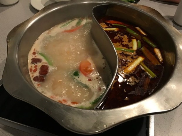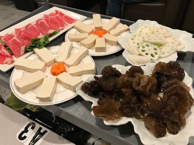 First we chose two broths. One was spicy though we asked for the mild version of it and the other was a lovely broth. Both lacked the usual knobby bits of wood I’m used to in hot pot broths but I actually like this better so I didn’t have to strain out the medicinal tasting bark bits.
