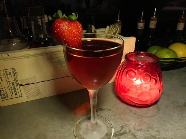 Then I had this wonderful Negroni variation. The Solstice Negroni uses a strawberry-rhubarb sweet vermouth as a strawberry infused Campari. And if you aren’t in a gin mood, you can sub in mezcal or rye whiskey for $2 more. I also asked for this to be served up in a Nick and Nora glass — it says N&N glass on the menu. What I liked about this was despite all that strawberry, it was really just the flavor. It wasn’t a juicy drink at all. Truly a stirred cocktail.