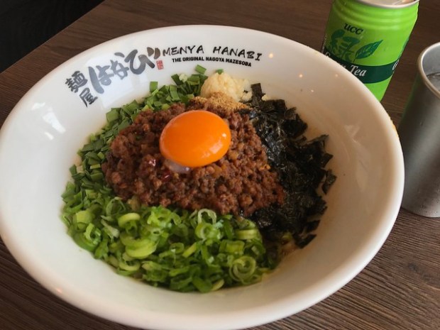 So let’s talk about Menya Hanabi. It’s a chain from Japan originating from Nagoya. The noodles were based on a Taiwanese dish (dan dan mian) which the Japanese call Tan Tan men or Taiwan ramen. However, what’s innovative are these noodles are served without soup like the traditional Taiwanese way (I’ve had tan tan men with soup and quite enjoy it that way). I have been eating Hachioji’s dry ramen for a few months now and while I like both, I like Menya’s simple bowl. It’s a mix of noodles, spicy pork, raw egg, seaweed, fish powder and green onions. You could get the egg poached but the raw yolk is integral to mixing the bowl to your desired flavor bomb. Plus you can add vinegar and chili powder too.