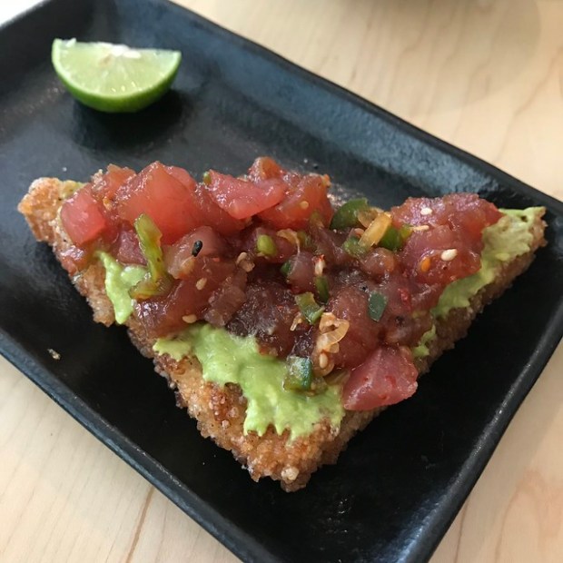 What’s better than spicy tuna on crispy rice? Add in avocado and serve it on a large wedge of crispy rice. Awww, yeah!
