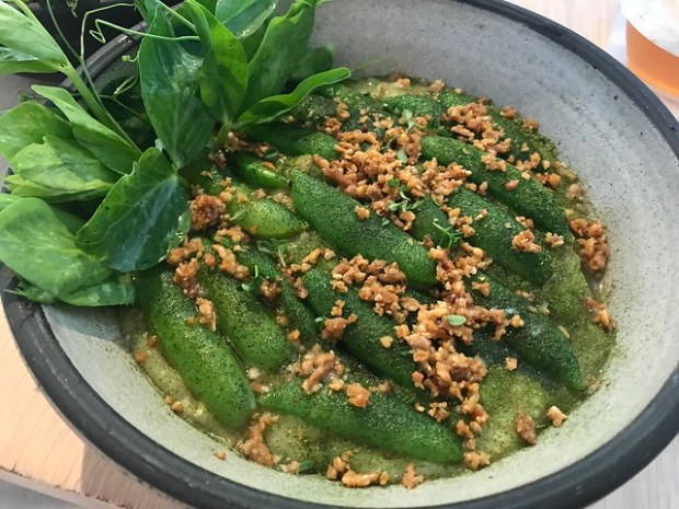The rice porridge was just what I wanted. And I loved all the peas and pea tendrils. Plus the green strawberry (the dried stuff on top) added a nice crunch to the whole dish. I’m in love.