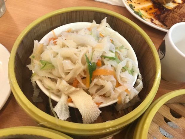 The two standards that I judge all dim sum on are har gow and siu mai. The siu mai (shown above) are pork dumplings. These were fine. I found them a bit small (I’m now used to the pleasantly plump ones in the San Gabriel Valley). The har gow aka crystal shrimp dumplings were also just fine. We did get a few of these but as mentioned, ordered more siu mai.