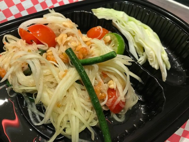 Yes, we got green papaya salad. The salad probably needed a little more heat. I did appreciate the dried shrimp and sliced cabbage. But what’s up with the huge long pieces of green beans? I like to be surprised if it’s a green bean or sliver of chile pepper.
