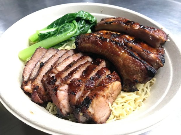 bbq pork and ribs over egg noodles