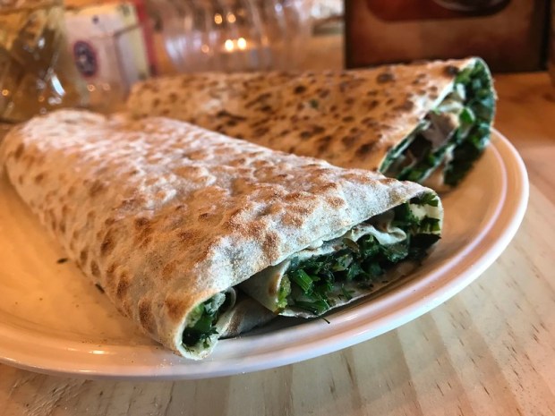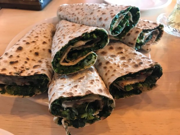 Zhengyalov hatz is the name of the stuffed lavash. It is vegan unless you ask for butter. Many of the herbs are specially grown for the cheerful store. There are over a dozen herbs. I wish we could dine in these days but there are a few tables outside.