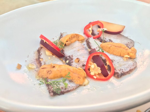 After months of eating my own cooking, I relish anything I wouldn’t make myself. Despite its seemingly simplicity, I would never think to lay out hamachi and uni like this. Topped with nectarines and sliced peppers, this was a decadent dish and just perfect for our light yet filling meal.