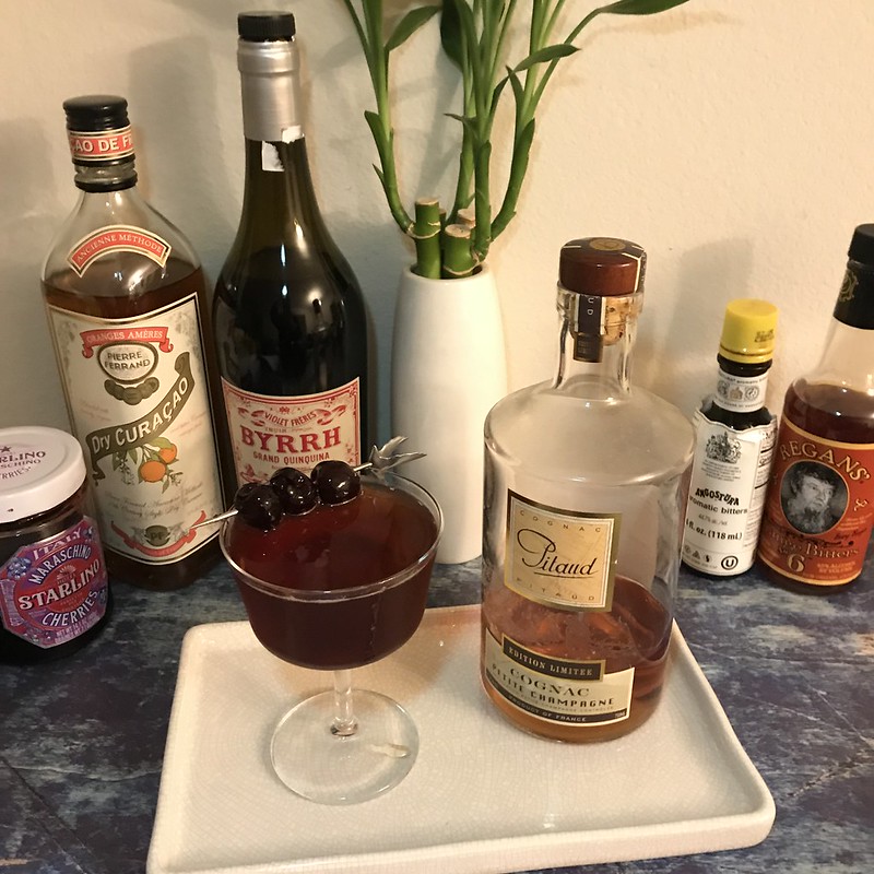 I made one with deciding to go with both orange and aromatic bitters. His recipe calls for 1.5 oz of cognac but I used 2 ounces as I prefer just a bit heavier hand on the base spirit. This recipe will be a fun one to play with because I became quite obsessed with orange curacao and have Cointreau, Grand Marnier as well as Brovo Spirits’ orange curacao to play with. I suspect I’ll want the sweeter Grand Marnier. The Ferrand dry curacao was fine here but with the bitter Byrrh, it made the drink quite dry.