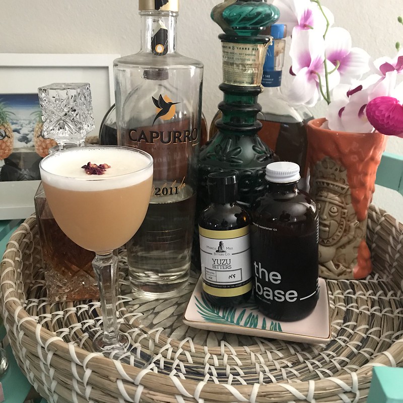 The above pisco sour uses Pisco Capurro, The Base Co grapefruit basil syrup in place of simple syrup and I used Miracle Mile yuzu bitters instead of the more typical Angostura bitters. Because I knew I wanted top with a dried rose bud, the bitters are shaken with the drink instead of sprinkled on top.